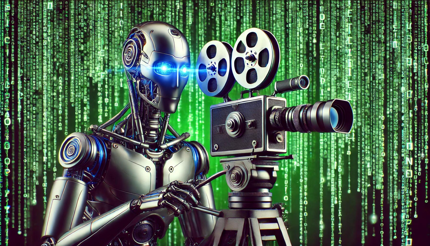 Prompt : « créer une image parlant d’audiovisuel et d’intelligence artificielle. Je veux un robot qui filme avec une vielle caméra de cinéma avec un fond à la Matrix en mode paysage avec la notion de collectif, de groupe de travail. Pour un article parlant d’intelligence audiovisuelle, concept qui vise à utiliser l’IA mais avec raison et surtout en restant collectif et humain. »