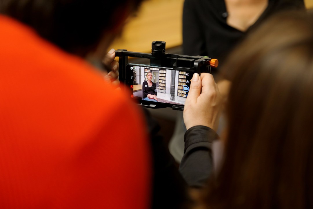 Pour le groupe MOBILE, un effort se fait au niveau de la pratique avec une mise en situation réelle sur 2 terrains de recherche choisis. Une première équipe tourne dans 2 laboratoires CNRS du Muséum nationale d’Histoire Naturelle et une autre à la bibliothèque Levi-Strauss au Laboratoire d’anthropologie sociale. Ces laboratoires ont accepté d’accueillir des stagiaires pour s’initier à la prise de vue et prise de son pour produire une capsule vidéo sur un angle de recherche du laboratoire.